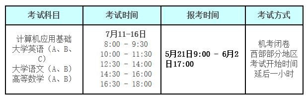 (1)《计算机应用基础》、《大学英语》(a、b、c)、《大学语文》(a、b)和《高等数学》(a、b)四门统考课程全部采用混编考场方式。报考时间如下: