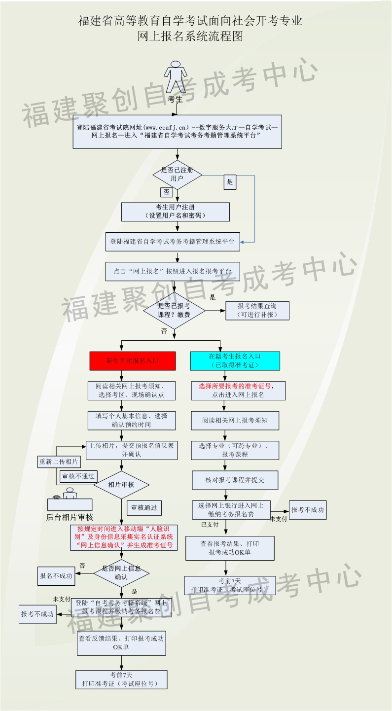 所有考生须登录福建省教育考试院尊龙凯时人生就是搏官网--数字服务大厅--自学考试--自学考试考务考籍管理系统综合业务平台,选择模块进入系统报名报考。具体报名流程详见管理系统发布的《考生须知》